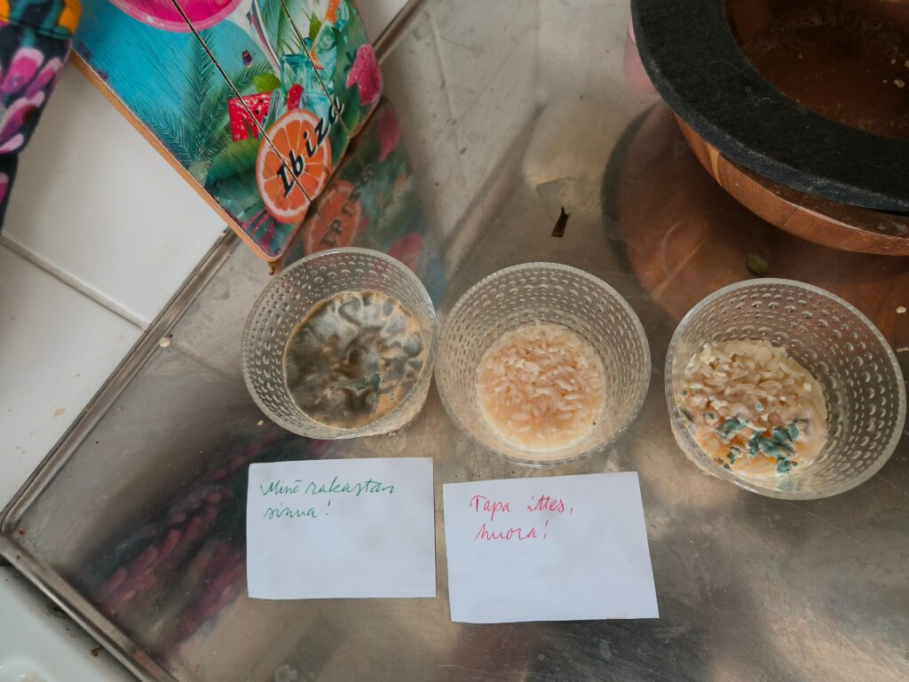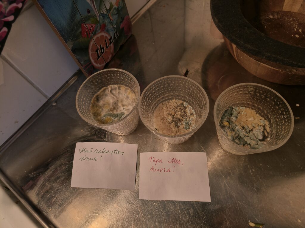 Uutena kehityksenä myös vihariisi on päivänä 12 alkanut homehtua. Jotain mustaa siinä on myös päällä, mutta kai sekin on pääasiassa hometta. Eli jos jostain voimme päätellä tästä minun riisikokeesta, niin riisi homehtuu kun sen jättää lasiin veden kanssa. Ei kovin suuri yllätys.
