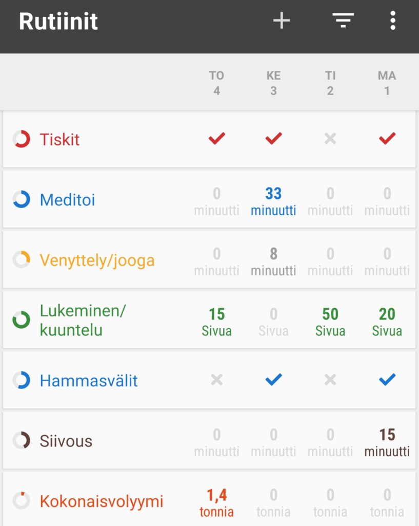 Mutta nyt siihen suositukseen – jota varten en ole edes saanut kannustimia! Loop Habit Tracker on tieteelliseen tutkimukseen perustuva sovellus, joka voi auttaa luomaan uusia (parempia) rutiineita. Sen idea perustuu yksinkertaisesti siihen, että merkitset, oletko tehnyt rutiinin tai montako minuuttia/kertaa/tms. teit jotain asiaa päivässä. Joskus streakin eli tavoitteiden suorittamisputken saavuttaminen voi kannustaa jatkamaan, vaikka oma motivaatio tehdä (etenkin aluksi) hankalalta tuntuva asia ei olisi korkea. Tähän (ja muihin pelillistämisen keinoihin) perustuu myös esimerkiksi Duolingo-kielipeli – älä katkaise streakkiä!